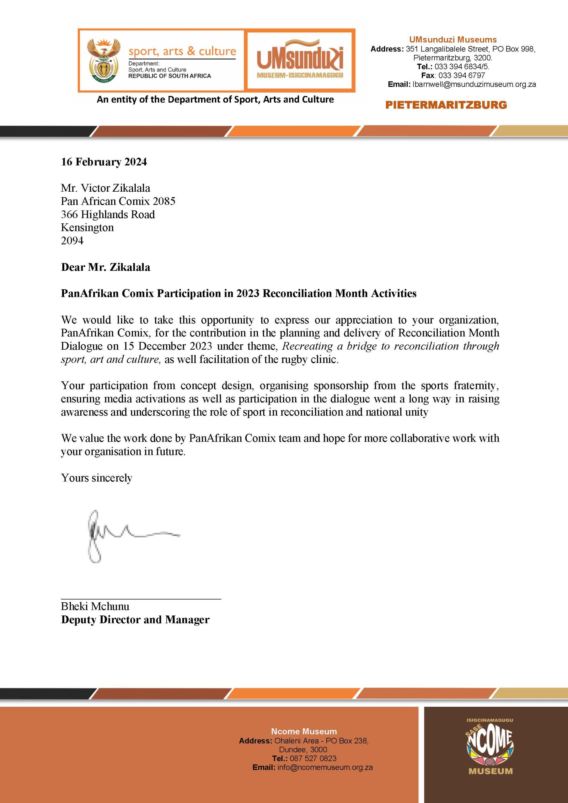 We would like to take this opportunity to express our appreciation to your organization, PanAfrikan Comix, for the contribution in the planning and delivery of Reconciliation Month Dialogue on 15 December 2023 under theme, Recreating a bridge to reconciliation through sport, art and culture, as well facilitation of the rugby clinic.
