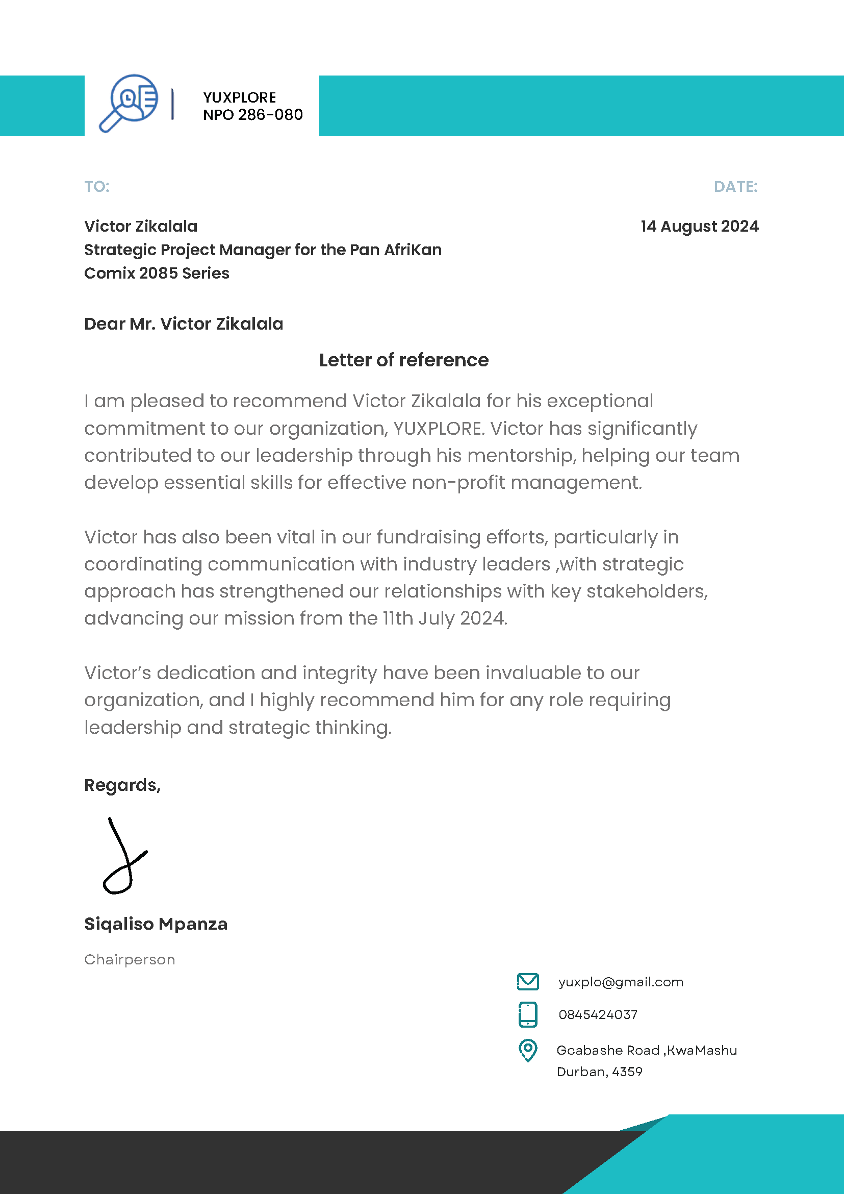 I am pleased to recommend Victor ZIkalala for his exceptional commitment to our organisation, YUXPLORE.